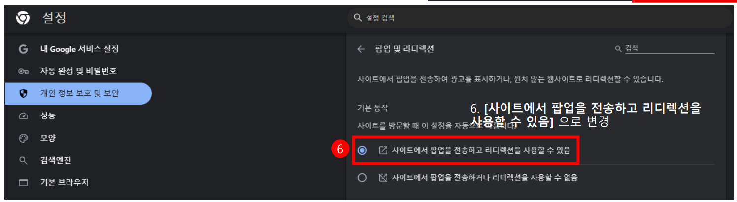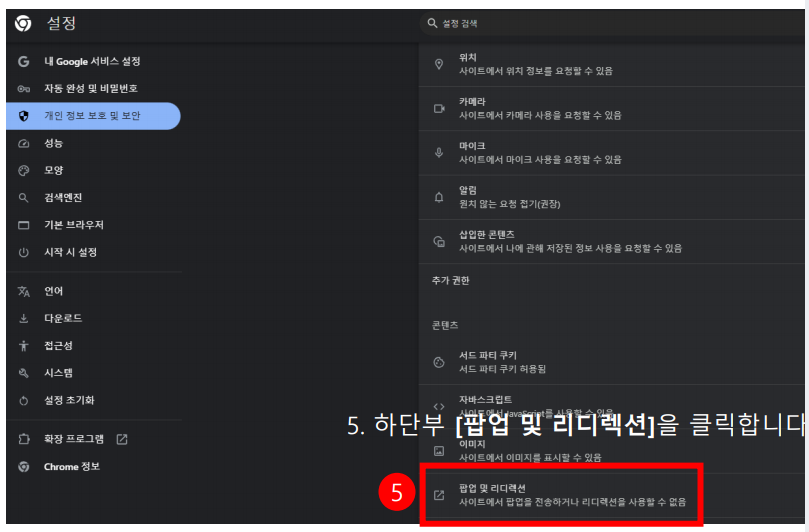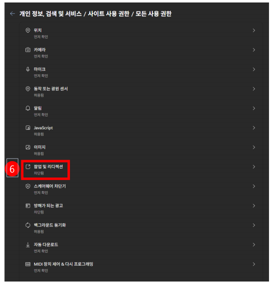 6. [팝업 및 리디렉션]을 클릭합니다.